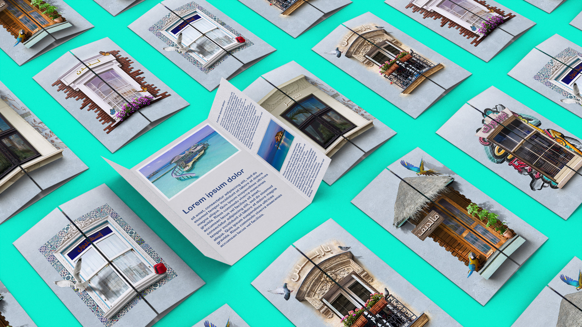 For Al Tayyar’s “باقات الشتاء” (#شباك_لباك) campaign, I developed a key visual that transforms windows into symbolic gateways, each framing a unique destination. This creative metaphor invited audiences to “peek” into diverse locales, capturing the magic of winter travel through a blend of nostalgia and anticipation. Each window was crafted with meticulous detail, reflecting the architectural and cultural identity of its location, while natural elements—such as birds and greenery—added warmth and vitality to the scenes. The result was a visual narrative that not only underscored Al Tayyar’s dedication to curated, memorable travel experiences but also evoked a sense of wonder, discovery, and personal connection with the viewer.