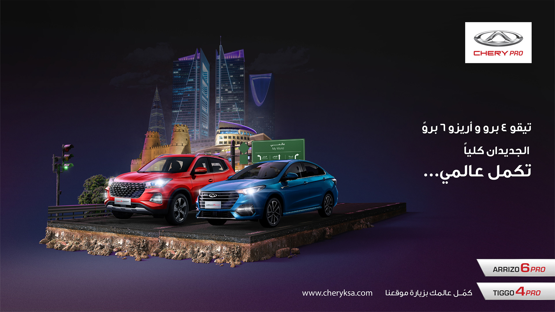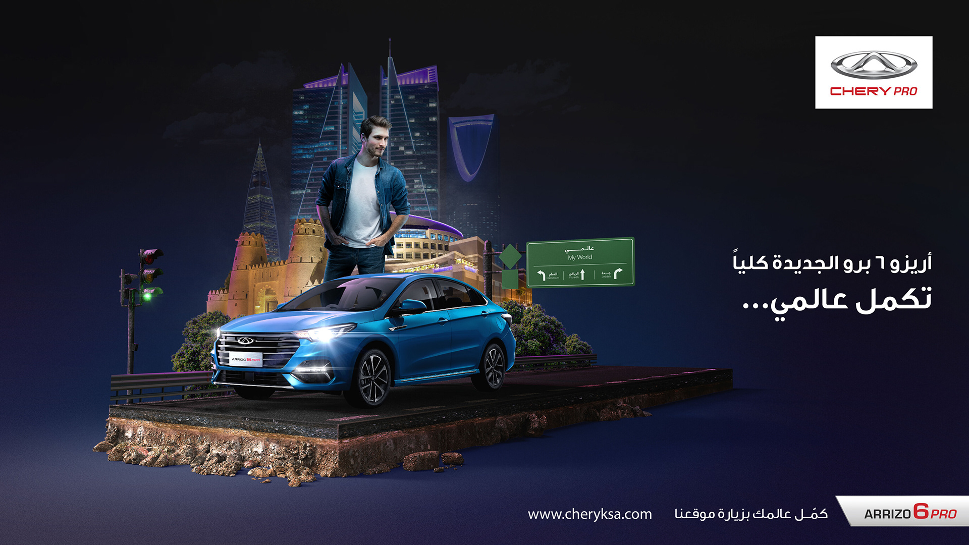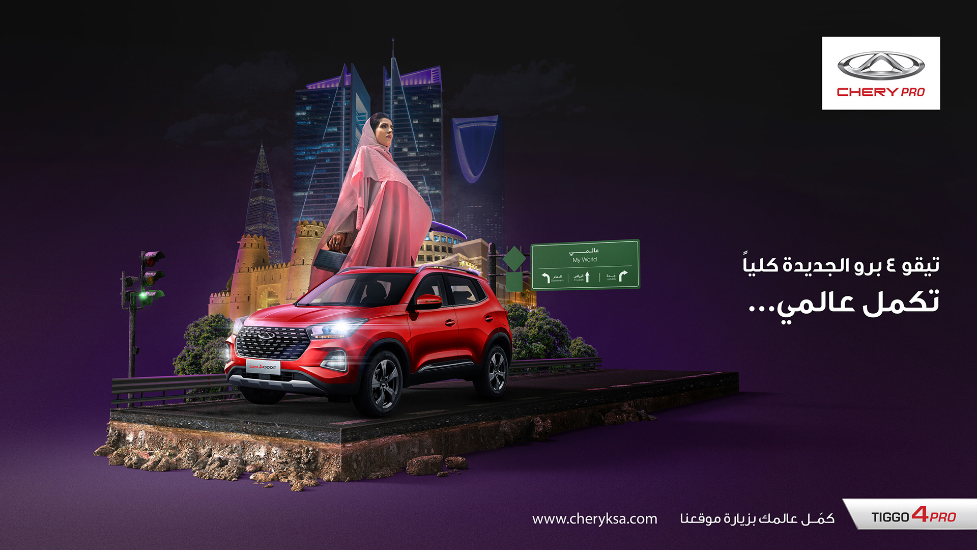 This campaign highlights the car's stylish and modern design against a backdrop of Riyadh’s iconic landmarks. The visual uses the tagline (“Completes My World”) to emphasize the car's ability to enhance one’s lifestyle and image. The composition features a prominent, confident figure standing next to the vehicle, which is positioned as a sophisticated and innovative choice for drivers in the region. This ad effectively combines local cultural elements with Chery’s brand values, making it relatable to the target audience.